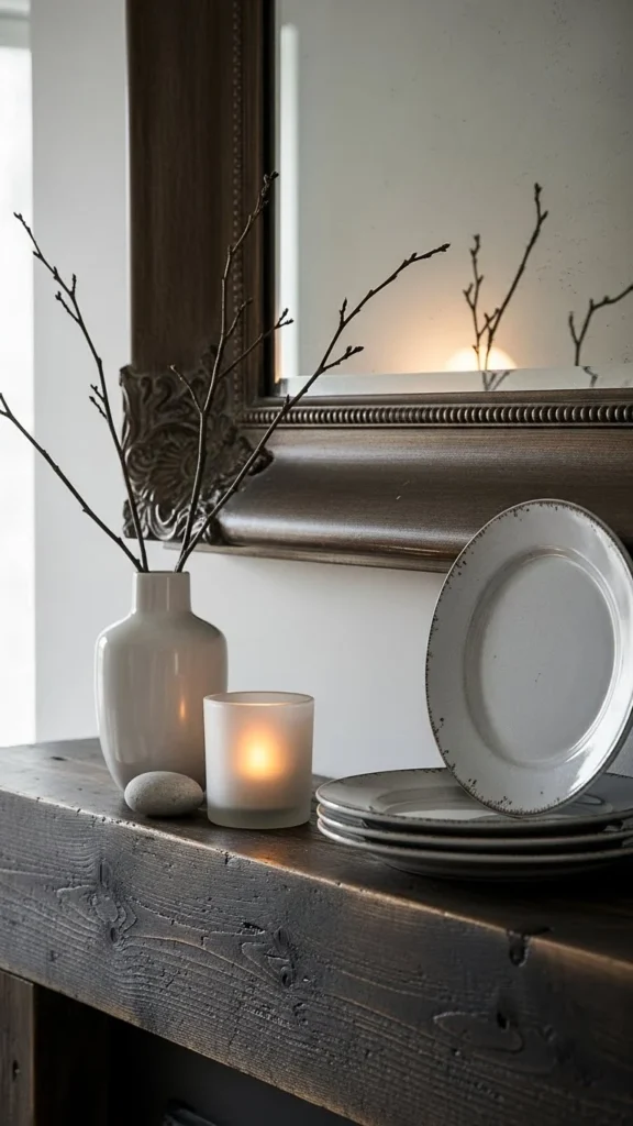 Avoid shiny finishes. Matte surfaces feel calmer. Wooden pieces balance candles and ceramics and help the mantel feel grounded and welcoming.