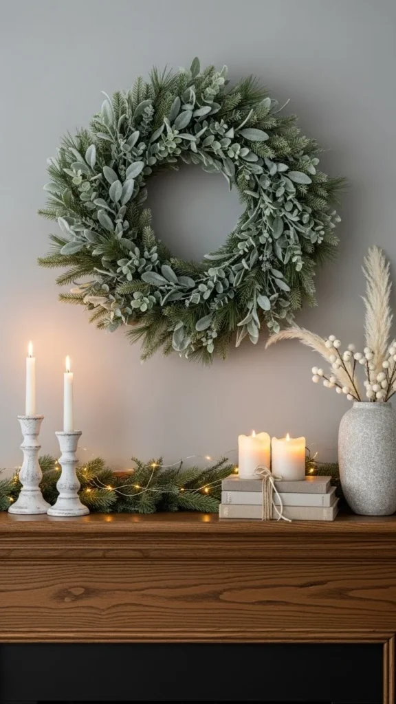 Pair the wreath with simple mantel decor below. Candles or vases work well. This setup feels seasonal without feeling busy and can stay up through winter months.