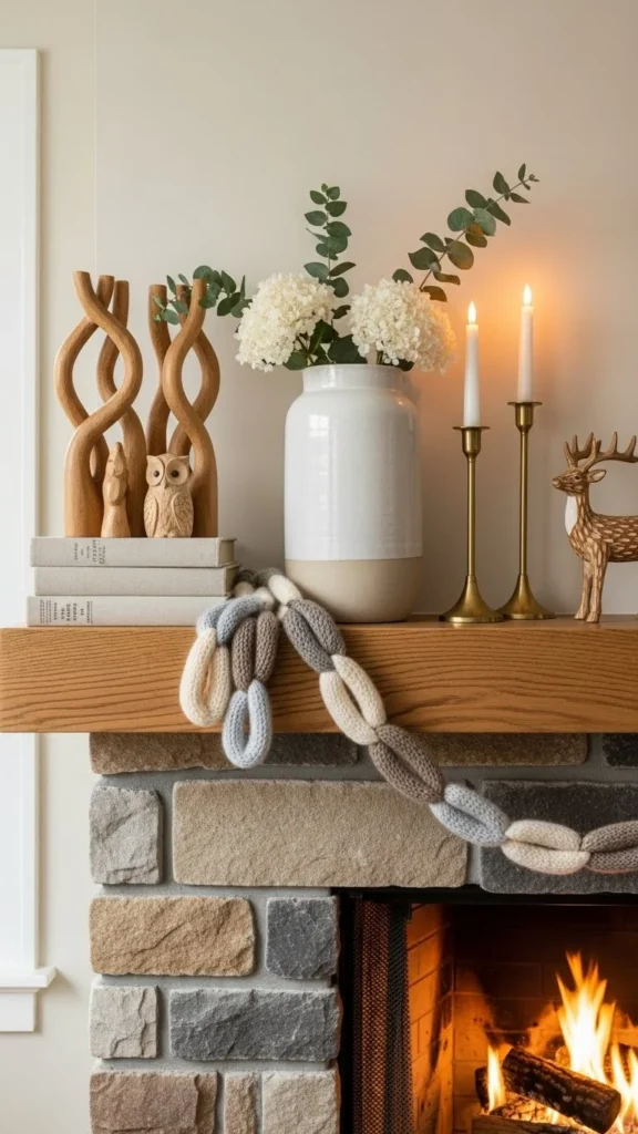 Wood brings warmth to mantel styling. Small wooden sculptures, bowls, or frames soften the space. Light or medium tones work well in winter.