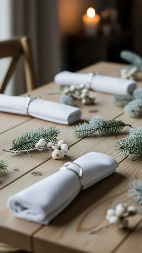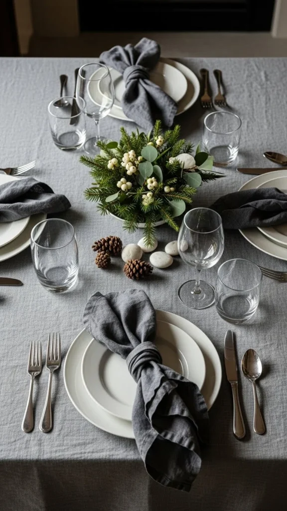 Greenery adds life without overpowering the table. Use eucalyptus, pine, or olive branches.