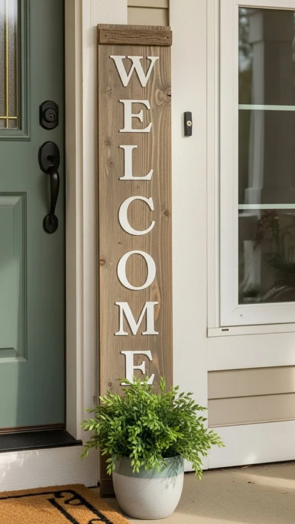 Styling matters more than decoration. Pair the sign with a woven doormat and one large planter. Avoid crowding the space.