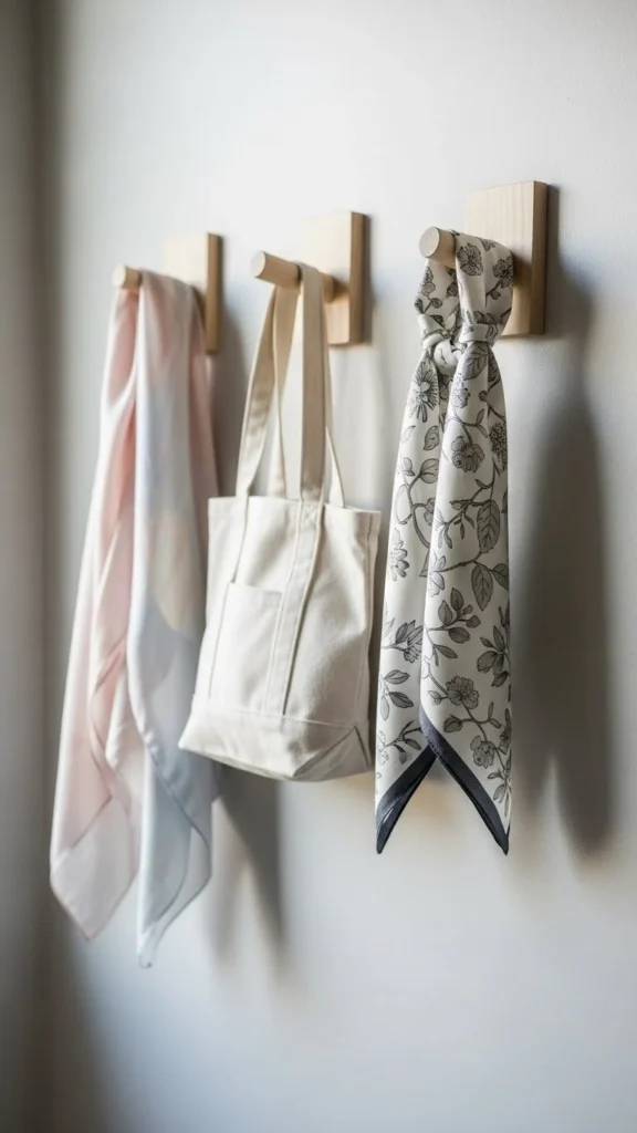 Wall hooks mix decor and storage.