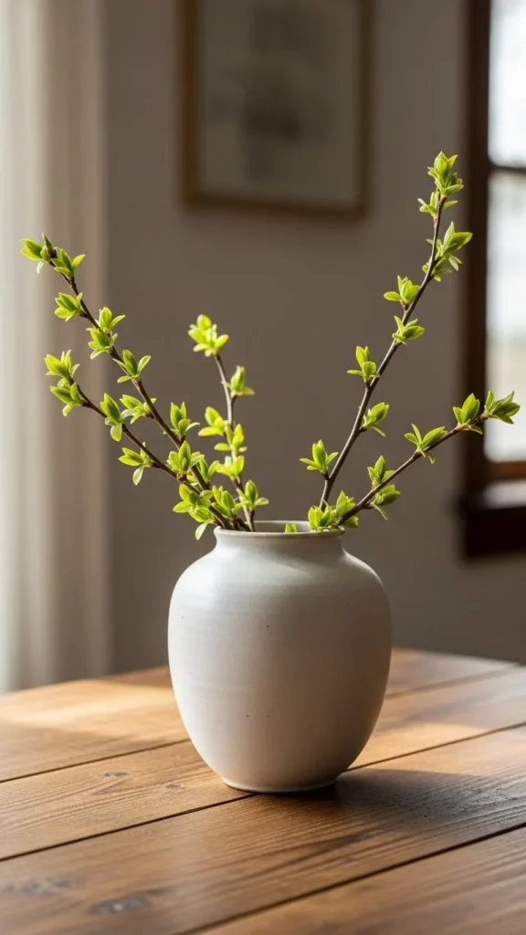 Use a single statement vase. Ceramic or glass works best. Avoid busy patterns so the branches stand out.