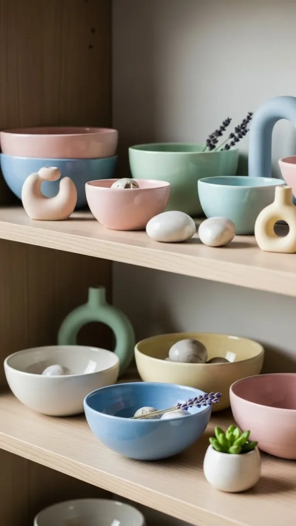 Small ceramic pieces in pastel shades bring color without overwhelming a room. Think bowls, planters, or trays.