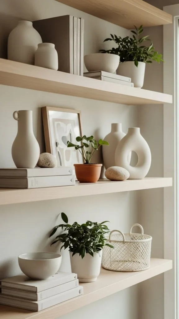 Leave empty space. Crowded shelves feel heavy.