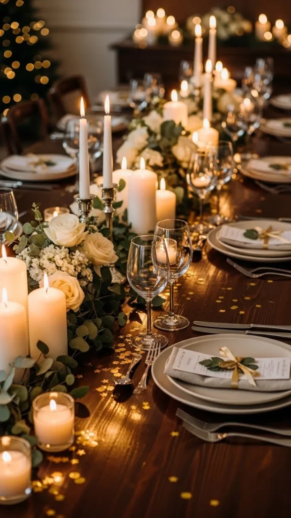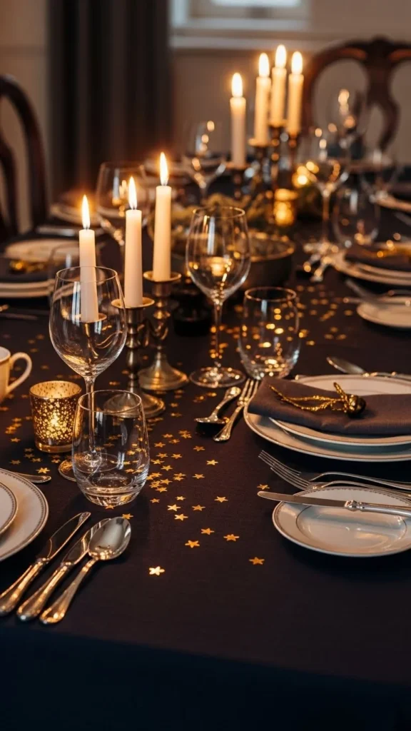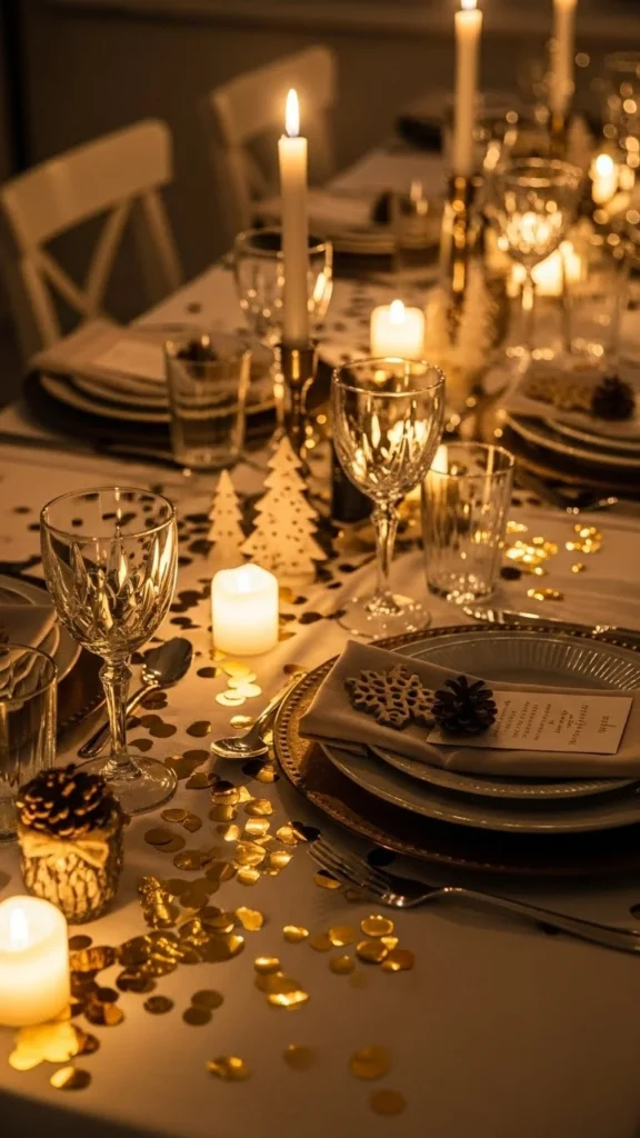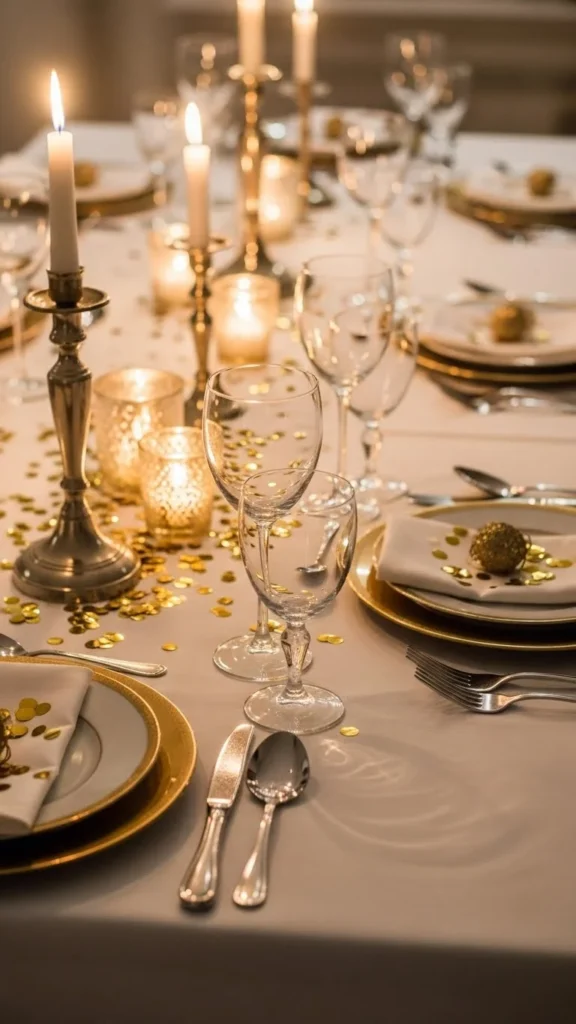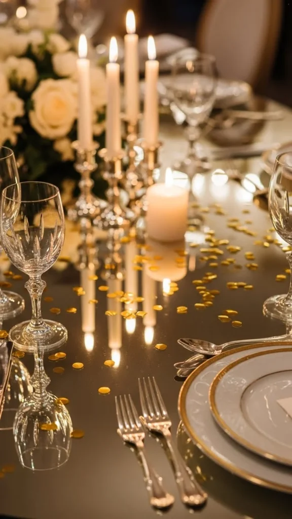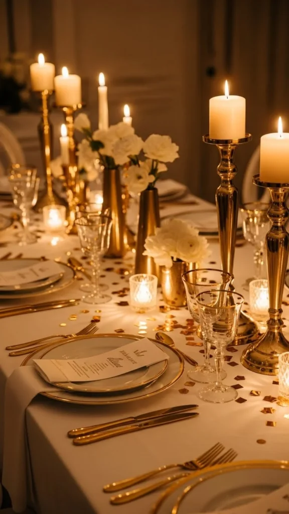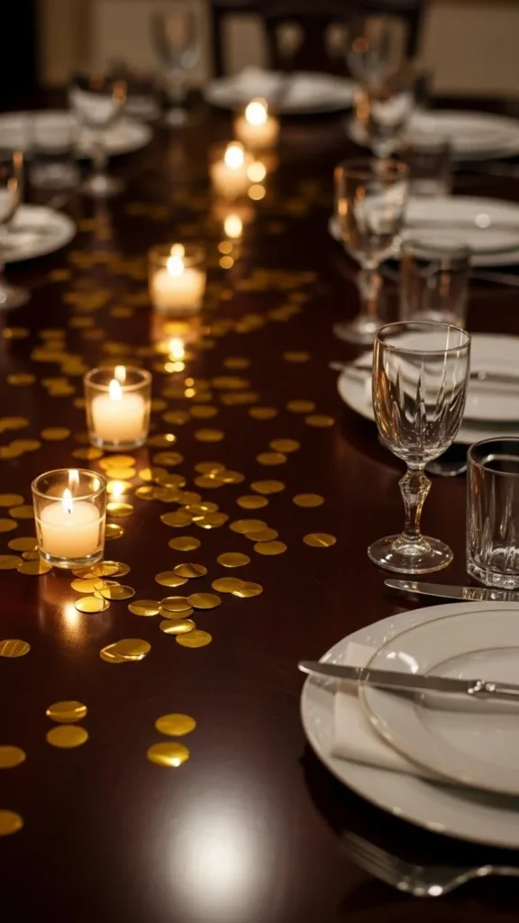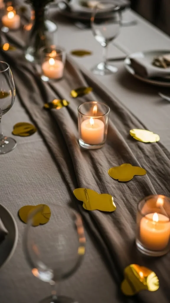 Candles and gold confetti work beautifully together. Place confetti around candle bases rather than across the whole table.