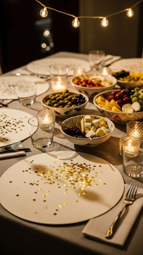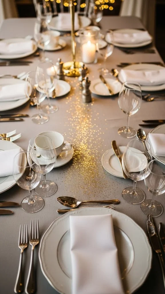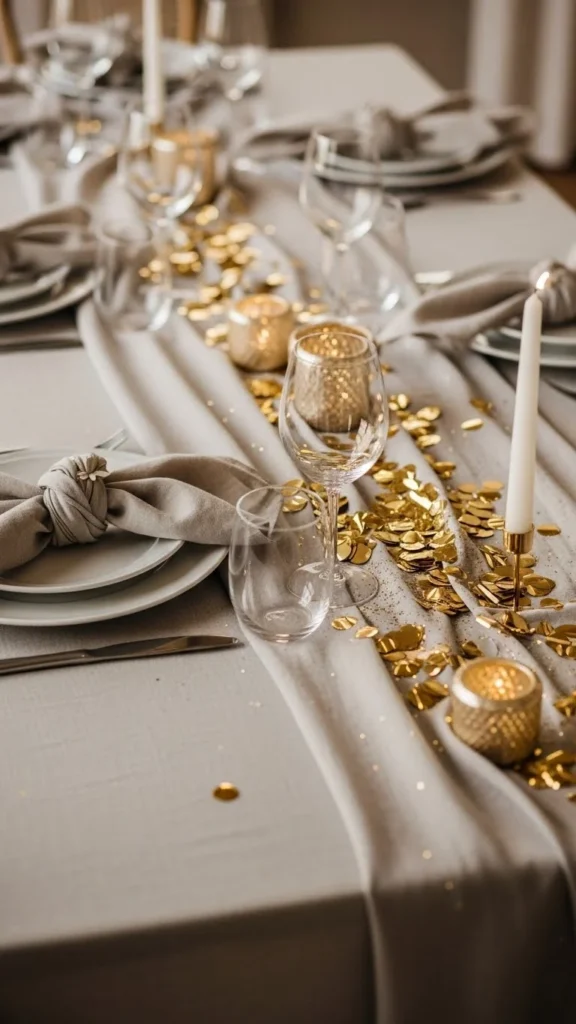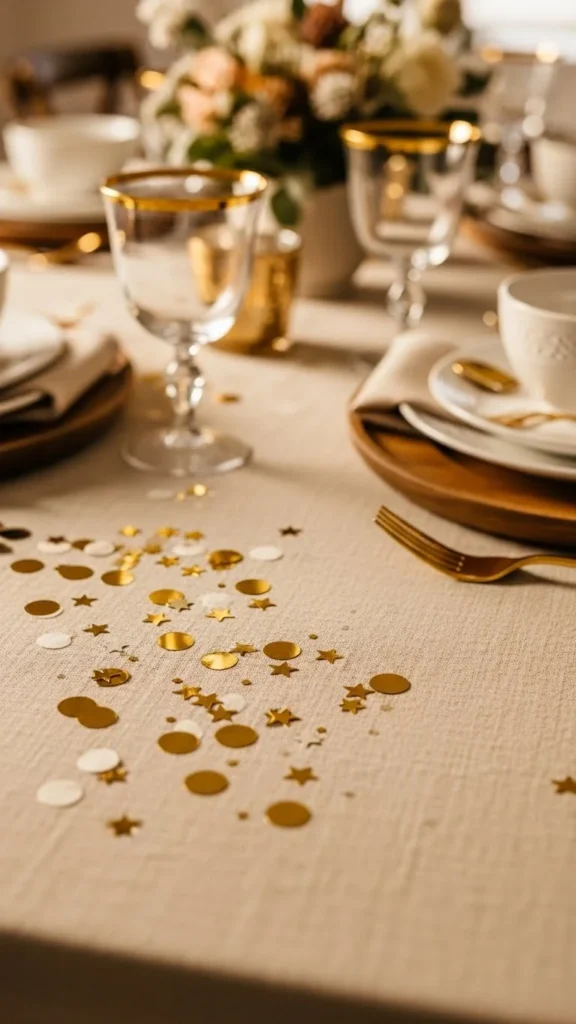 This style uses less confetti and looks intentional. It’s a great choice for dinner parties where you want sparkle without clutter.