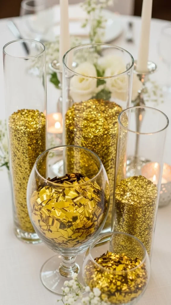 Filling clear vases with confetti creates sparkle without mess. Add candles or flowers above.
