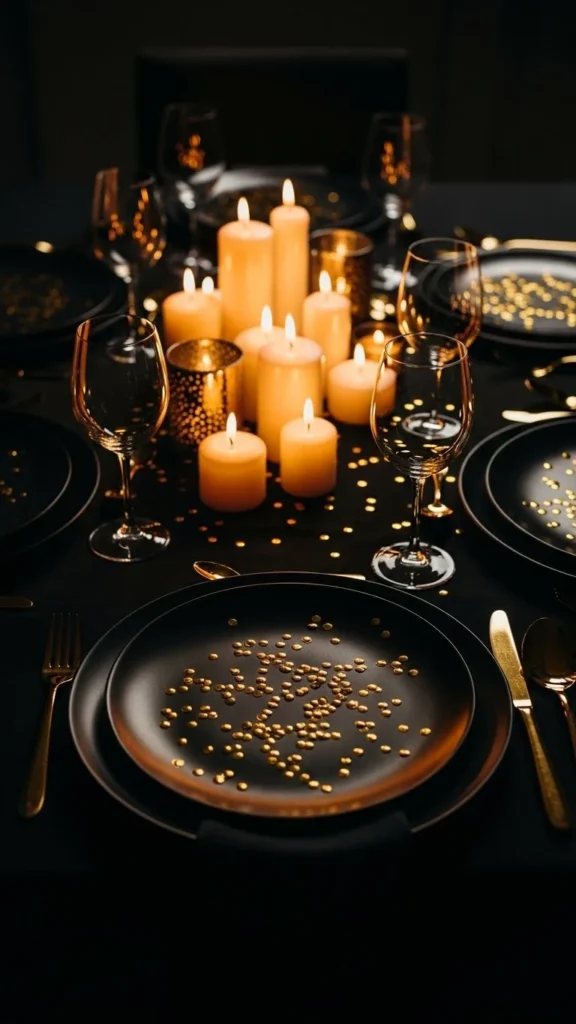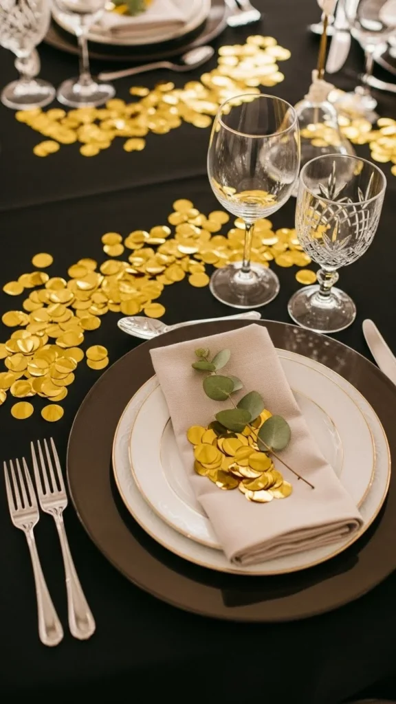 Black tableware makes gold pop. Use confetti sparingly for contrast.