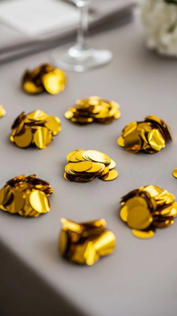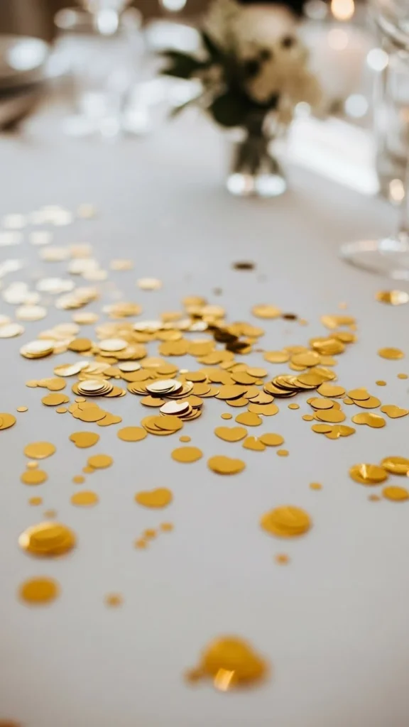 Round gold confetti is a timeless choice for party tables. The simple shape reflects light evenly and works well with almost any theme. You don’t need a lot. A light sprinkle down the center of the table creates sparkle without mess.