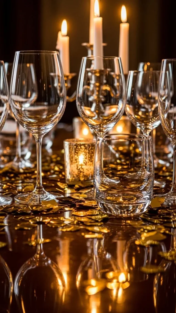 Glassware reflects gold nicely. Place confetti near stems or bases.