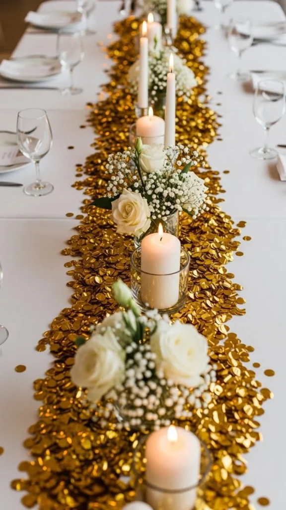 To keep cleanup simple, mix glitter with clear sand or salt. This adds weight and prevents it from spreading too far. Place it in a narrow runner-style line down the table.