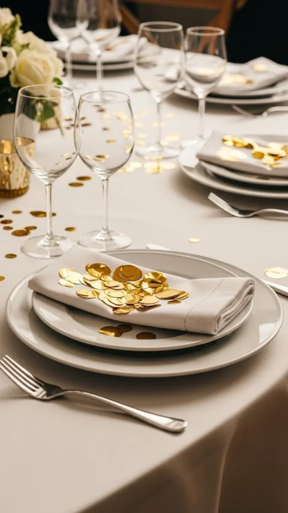 Confetti near napkins adds detail. Fold napkins simply and add a few pieces nearby.