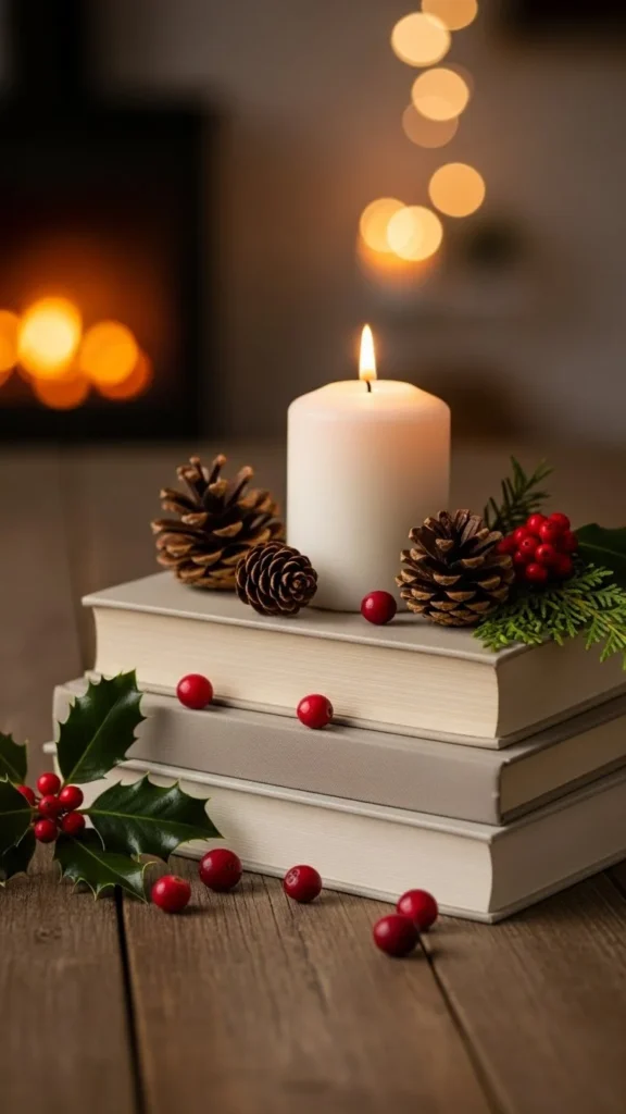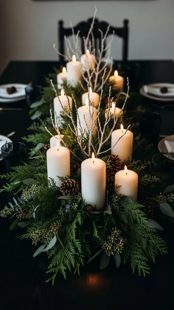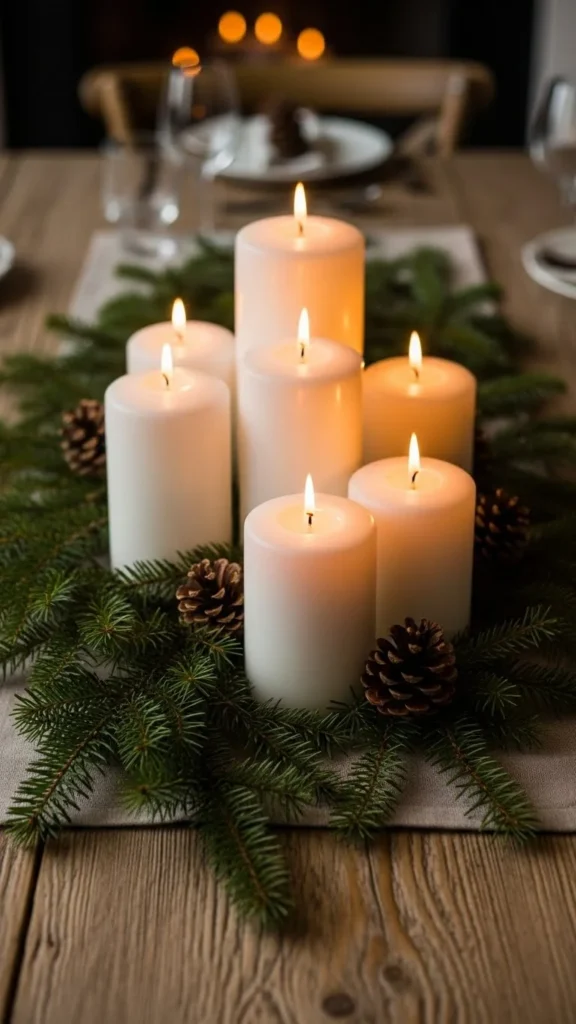 This setup works for almost any table size. Start with three or five candles in different heights. Place them close together. Tuck pine branches around the base. You can trim branches from a yard or park. Pinecones add texture and cost nothing if collected outdoors.