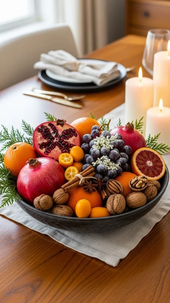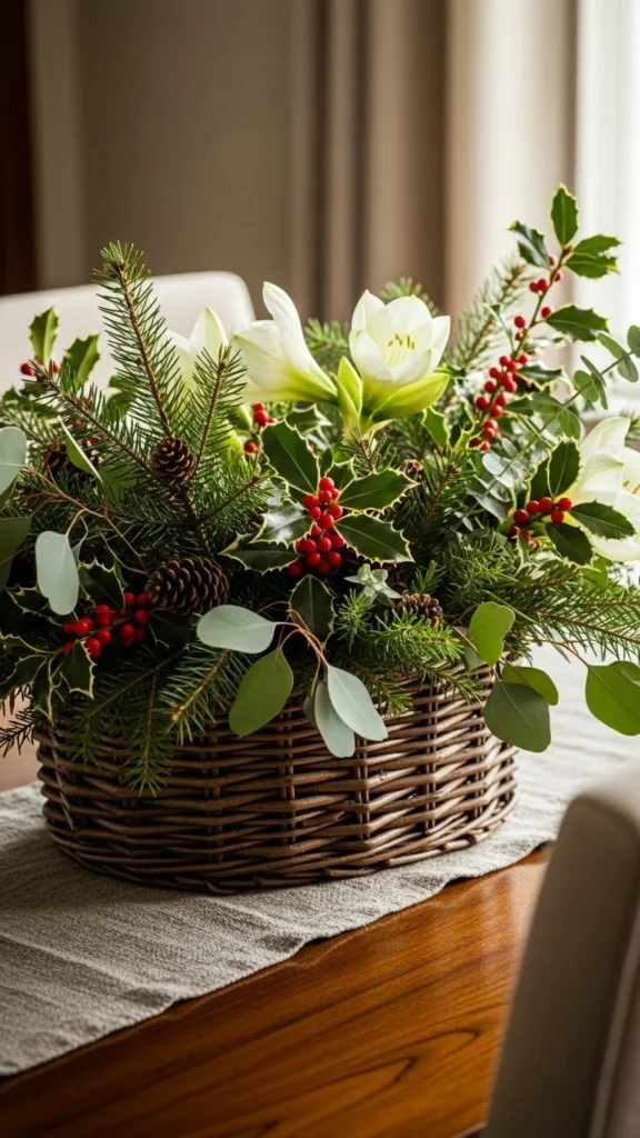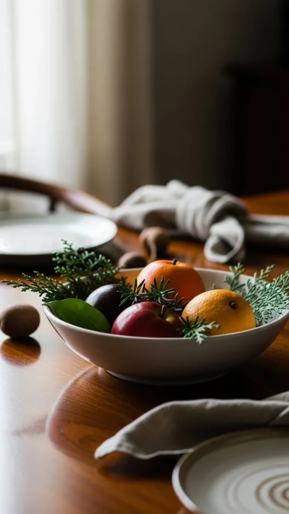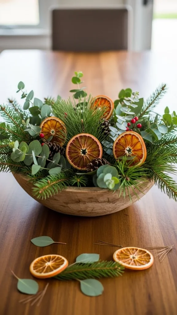 A wide bowl anchors a table without blocking views. Fill it with mixed greens. Eucalyptus lasts longer indoors. Pine adds scent and texture.