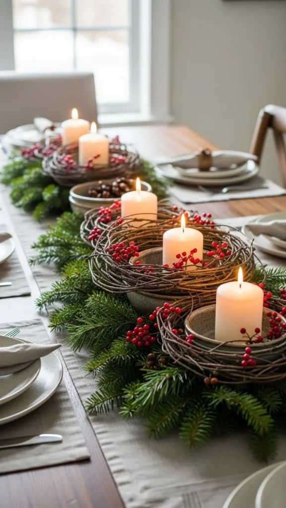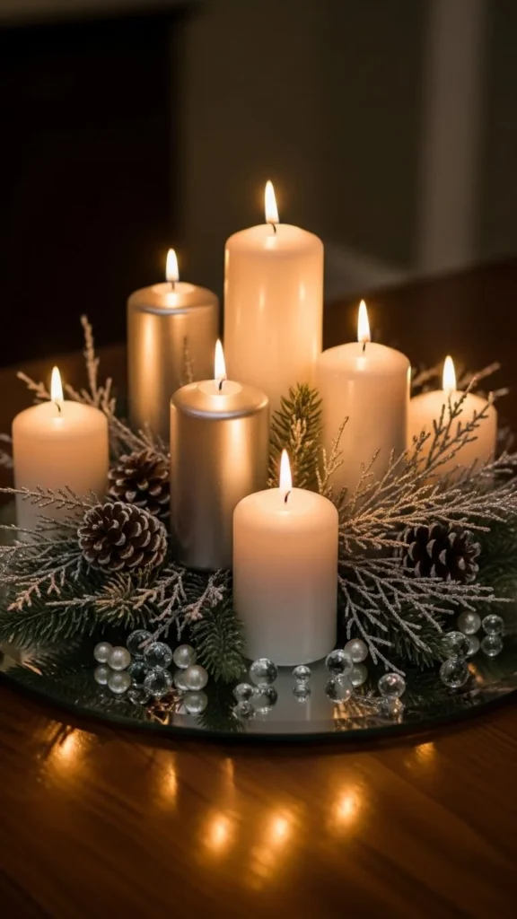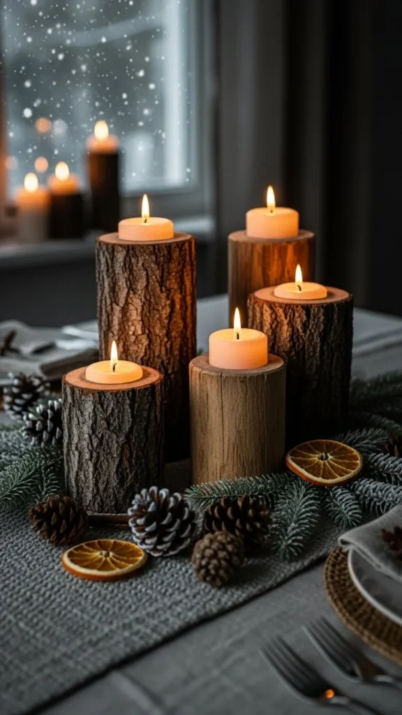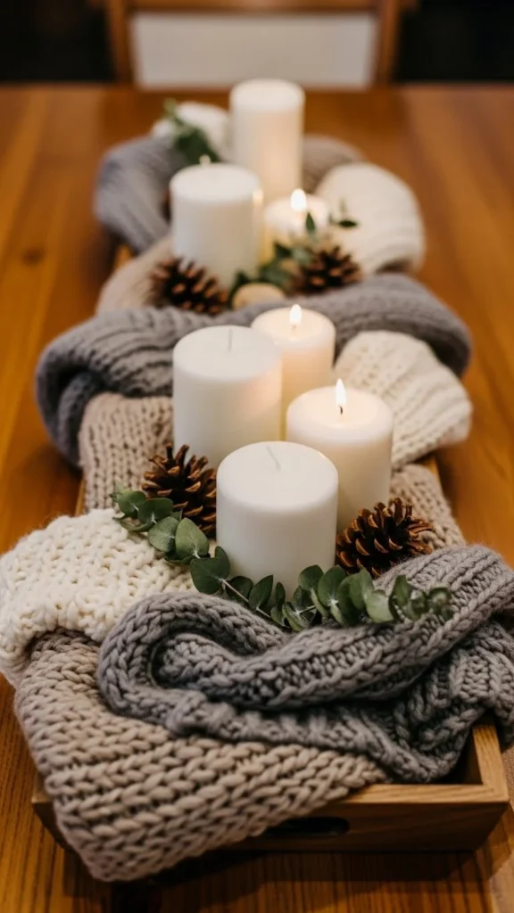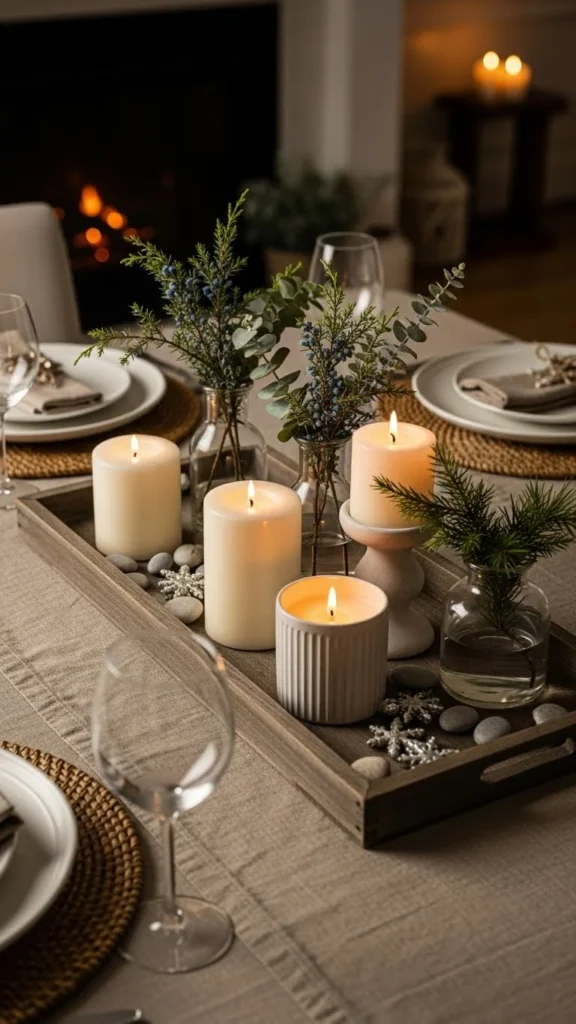 For a budget twist, wrap candle bases with twine or place them on thrifted plates. A linen runner underneath pulls it together. This centerpiece suits everyday dinners and winter gatherings without effort.