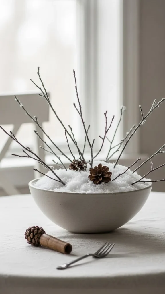 Fill a bowl with faux snow. Add branches lightly dusted.