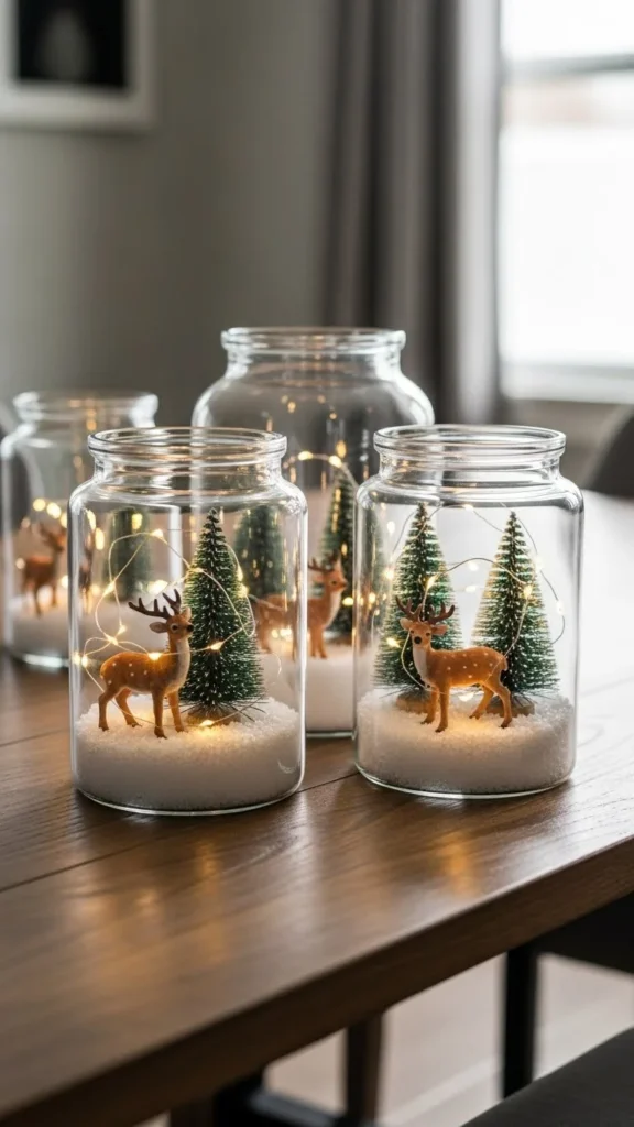 Save empty jars from sauces or candles. Fill them with faux snow, salt, or sugar. Add small trees, pine sprigs, or simple ornaments. Drop in battery fairy lights for glow.
