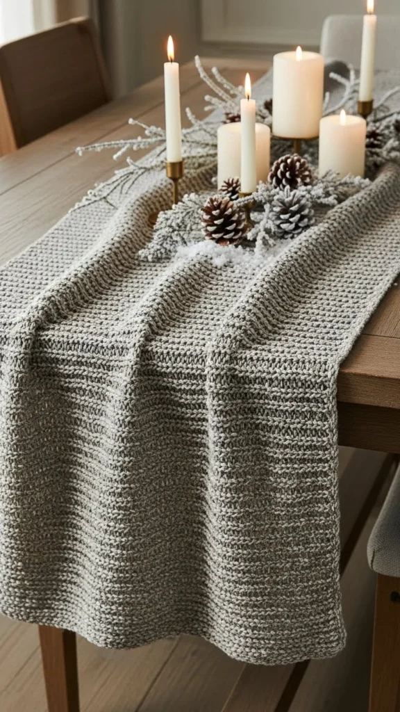 Fold a knit scarf or runner down the table. Place wooden elements on top. Add candles for warmth.