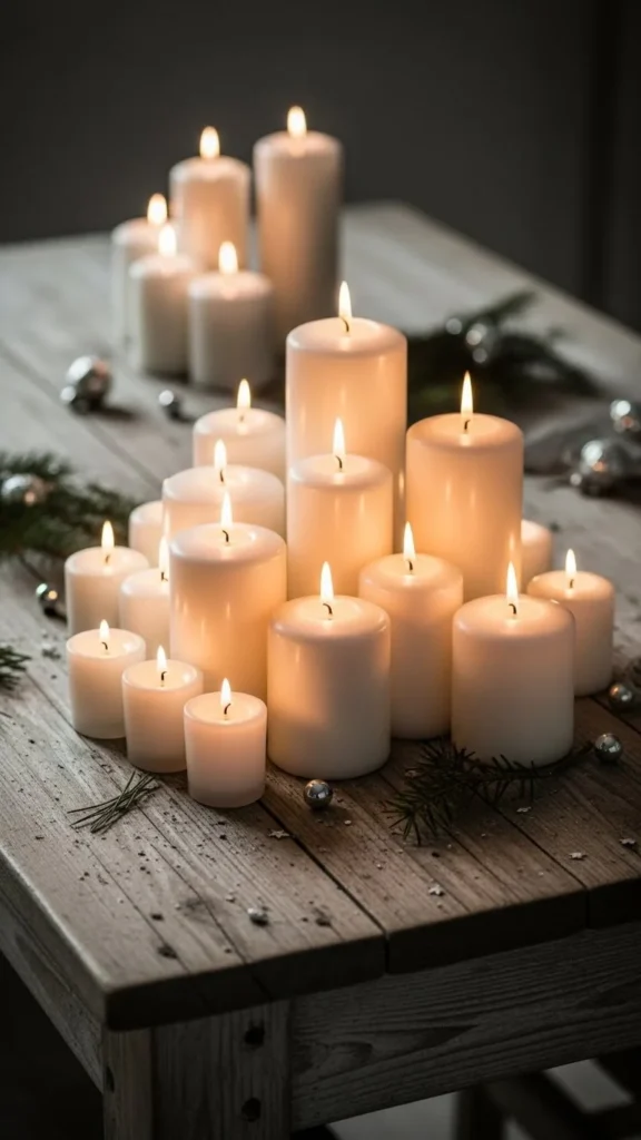 This look costs little if you reuse holders. Even mismatched ones work if the candles match. White or soft gray feels winter-ready.