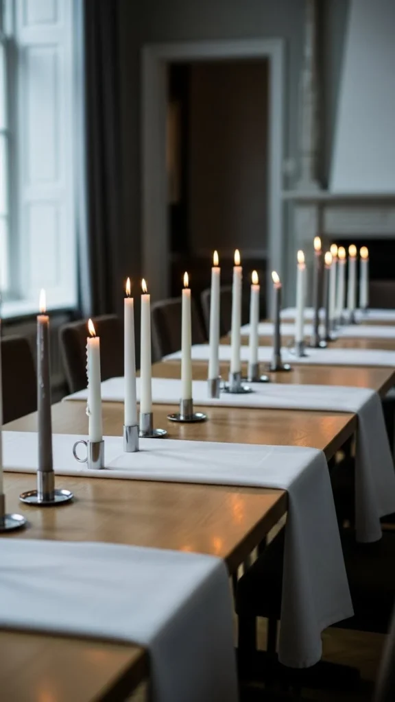 Line five or seven taper candles down the table. Keep holders simple and matching. Spacing matters more than decoration here.