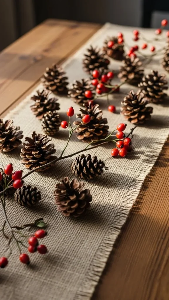 Lay a fabric runner down the center. Scatter pinecones along its length. Add faux berries for color.