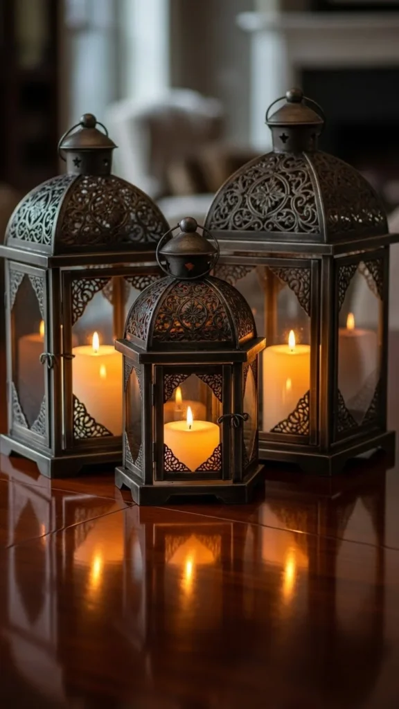 Lanterns bring instant winter mood. Use three in different sizes. Place candles inside.