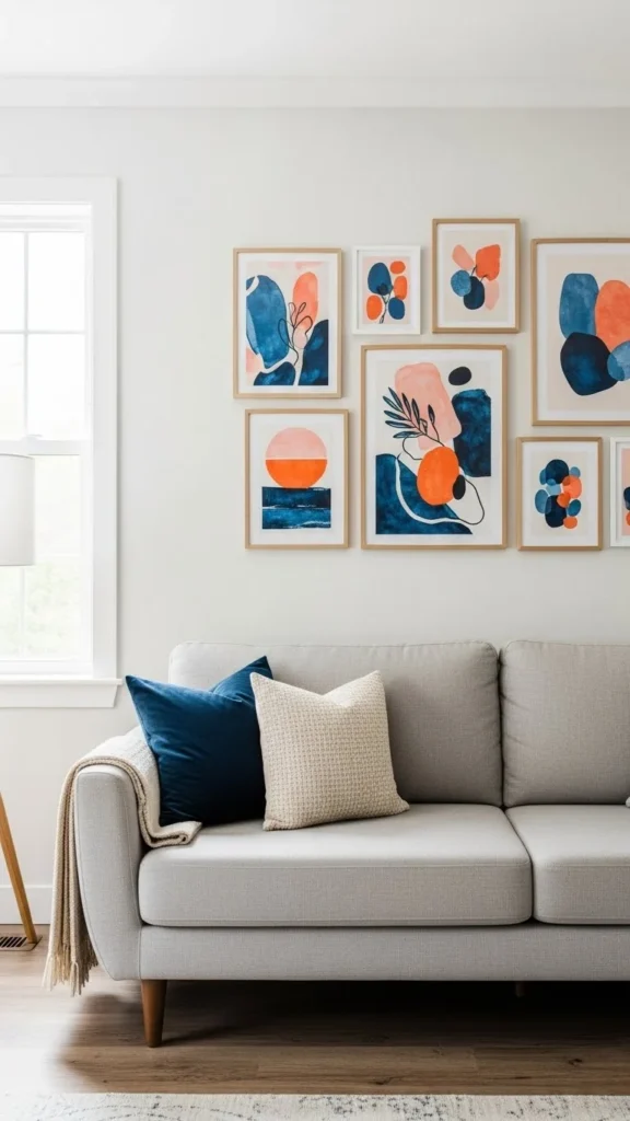 • Mix textures—canvas, framed prints, or sculptural pieces—for visual interest.
