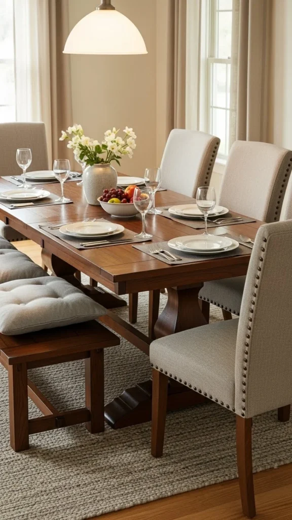 - Mix bench seating with chairs for a relaxed, contemporary look.