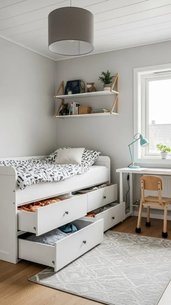 A functional kids room relies on smart storage. When kids can easily see and reach their things, cleanup becomes much easier.