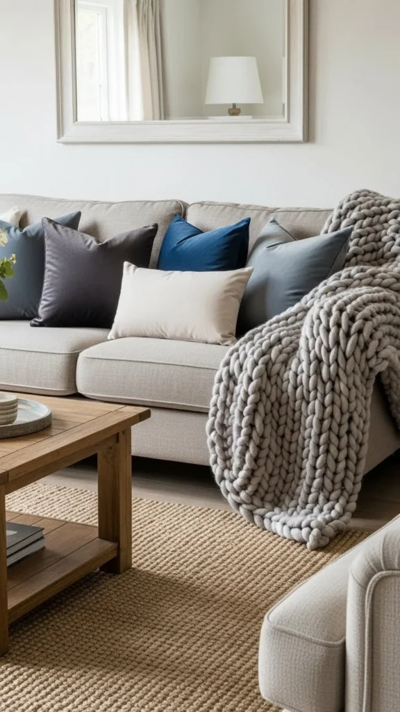 - Fabrics: Mix velvet, linen, cotton, and knitted throws.
