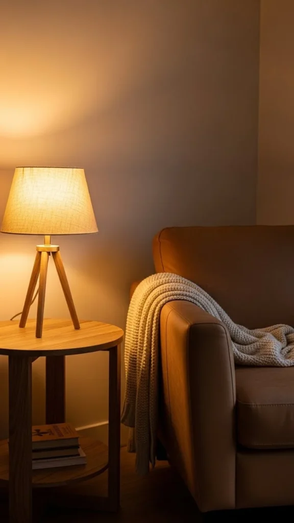 - Accent lighting: Highlight art, plants, or textured walls for depth.