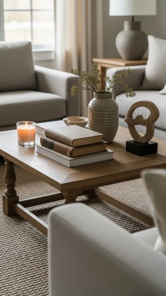- Wood: Coffee tables, shelving, or frames add warmth.
