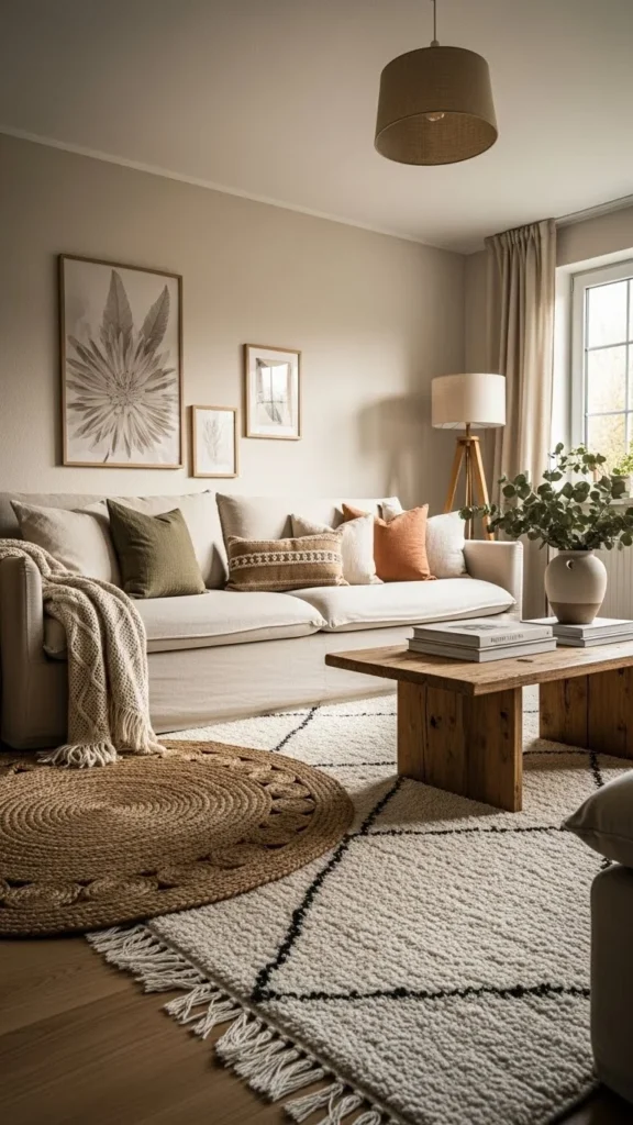 - Woven elements: Baskets, rugs, and lampshades introduce texture naturally.