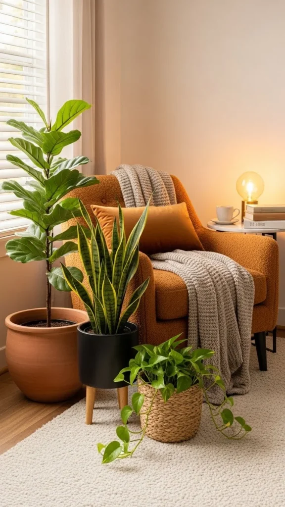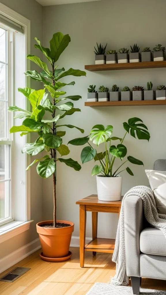 - Use floor plants like fiddle leaf figs or monstera to anchor corners.