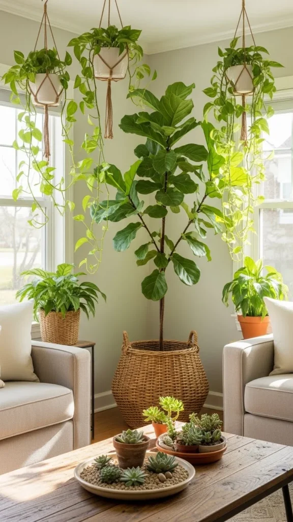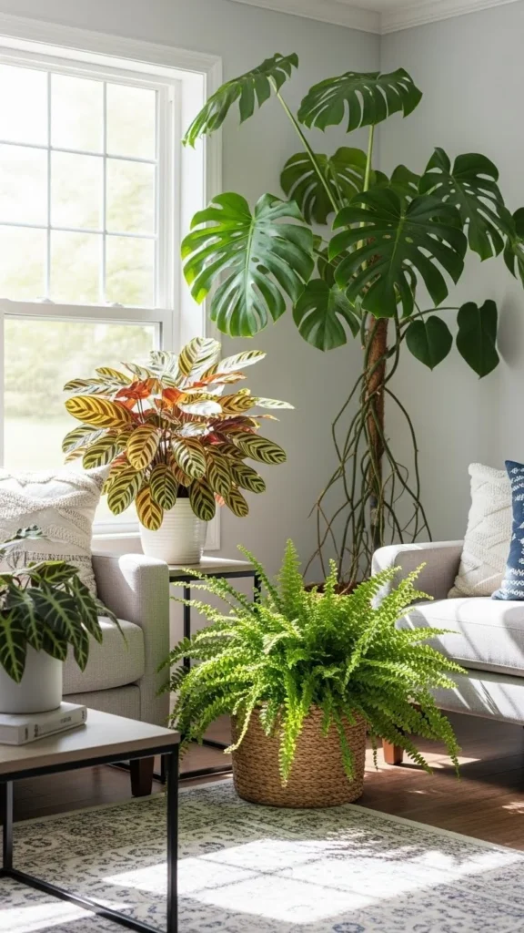 Variety adds depth and dimension to any room. Combine tall plants, medium-sized pots, and small tabletop greenery to create visual interest.