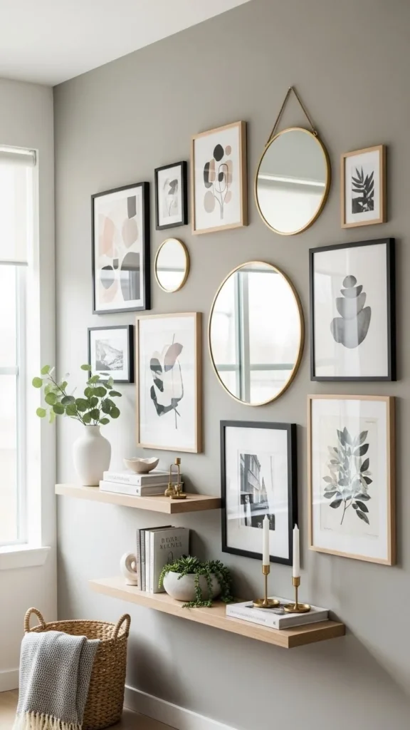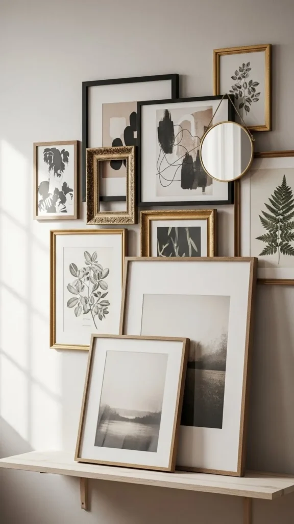 Don’t be afraid to overlap pieces slightly. Designers often layer items so that frames, mirrors, or shelves touch or partially cover each other.