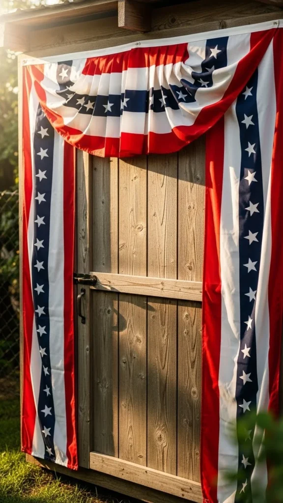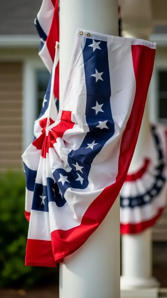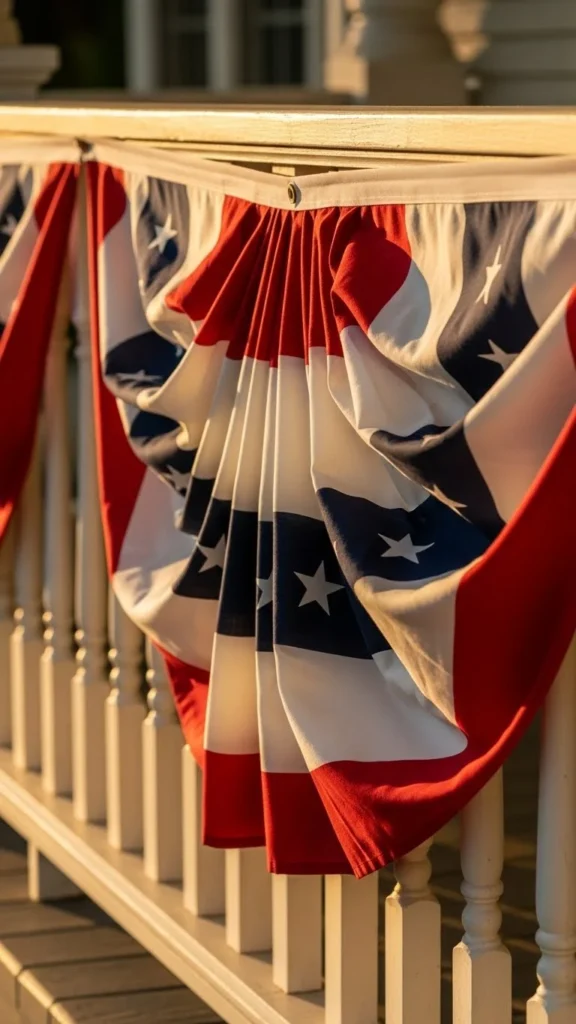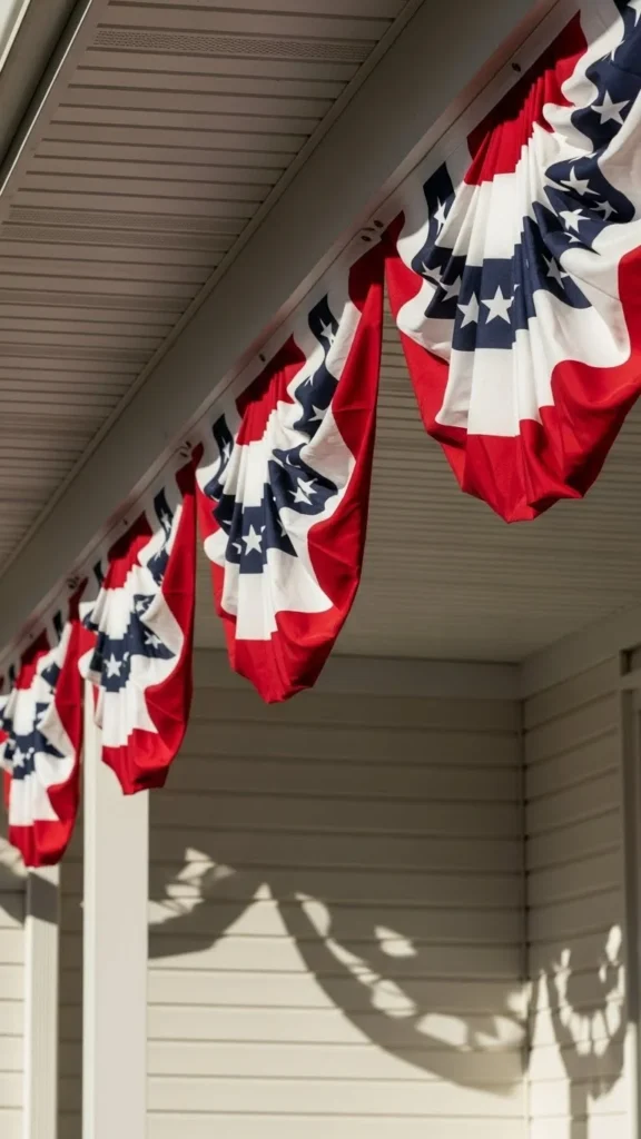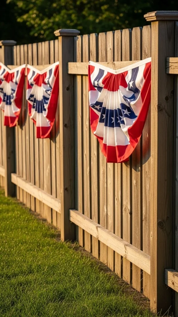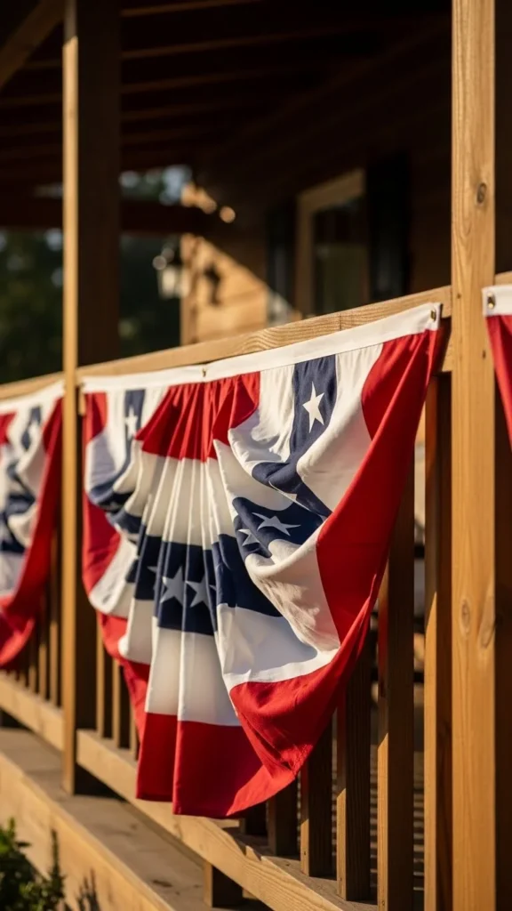 Porch railings are the easiest place to start. Pre-made bunting panels attach quickly with zip ties or cup hooks. You can space them evenly or let them hang loose for a relaxed feel. For tight budgets, cut fabric triangles from old sheets and paint stripes using stencils. Keep the height consistent so the look stays clean. This setup works well for Independence Day, Memorial Day, and Veterans Day. If wind is common in your area, add a small weight inside each fold. It keeps the fabric from flipping while still moving naturally.