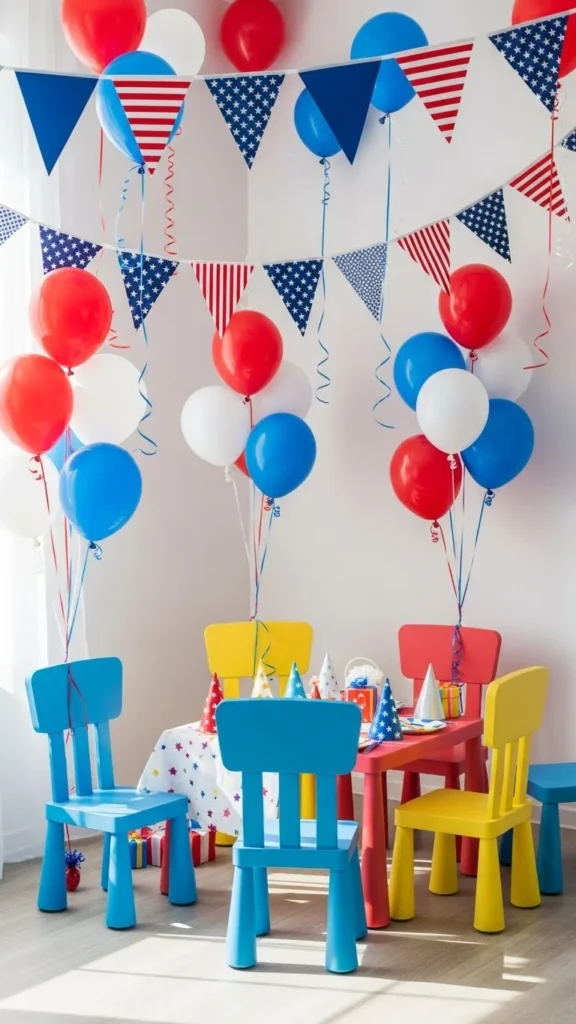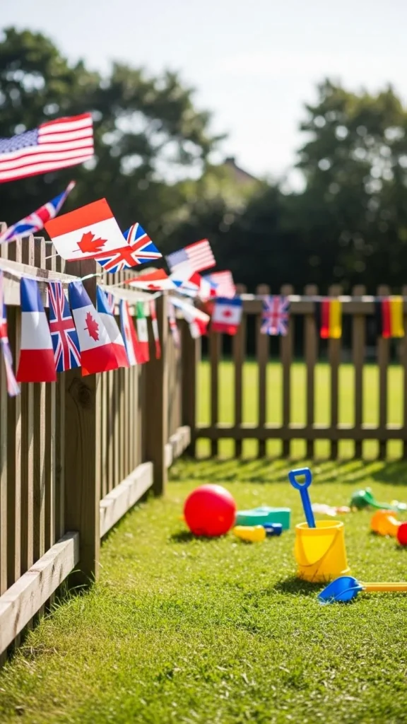 Bunting around play areas adds festivity without sharp objects. Use fabric ties instead of metal hooks. Keep it high enough so children cannot pull on it.