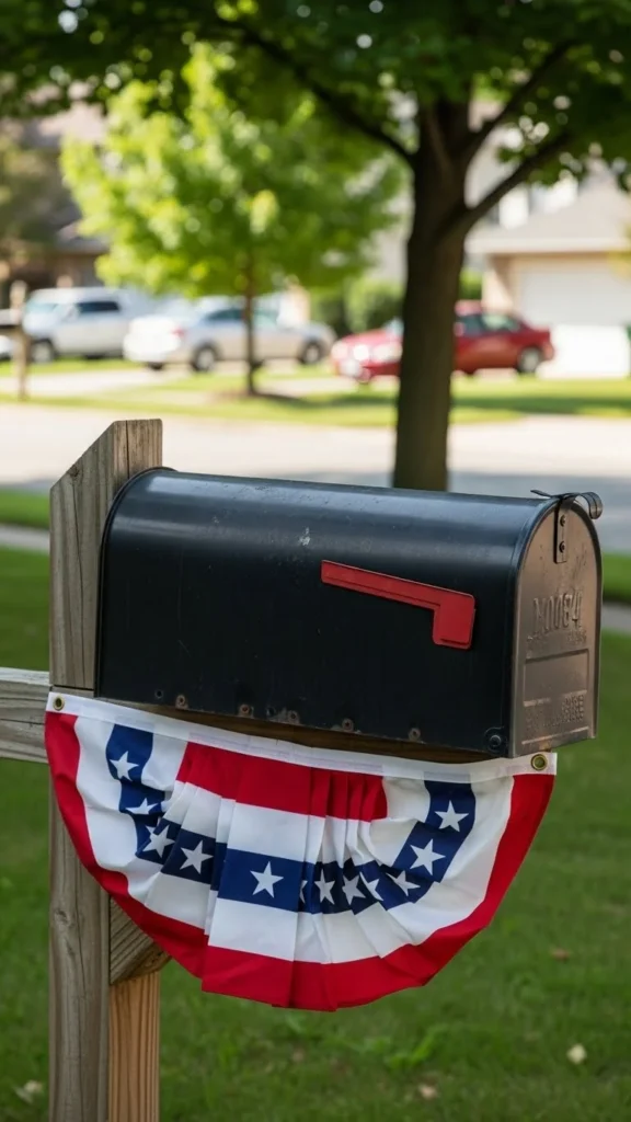 Wrap bunting around the mailbox post rather than the box itself. This keeps mail access clear. Weather-safe fabric lasts longer here.