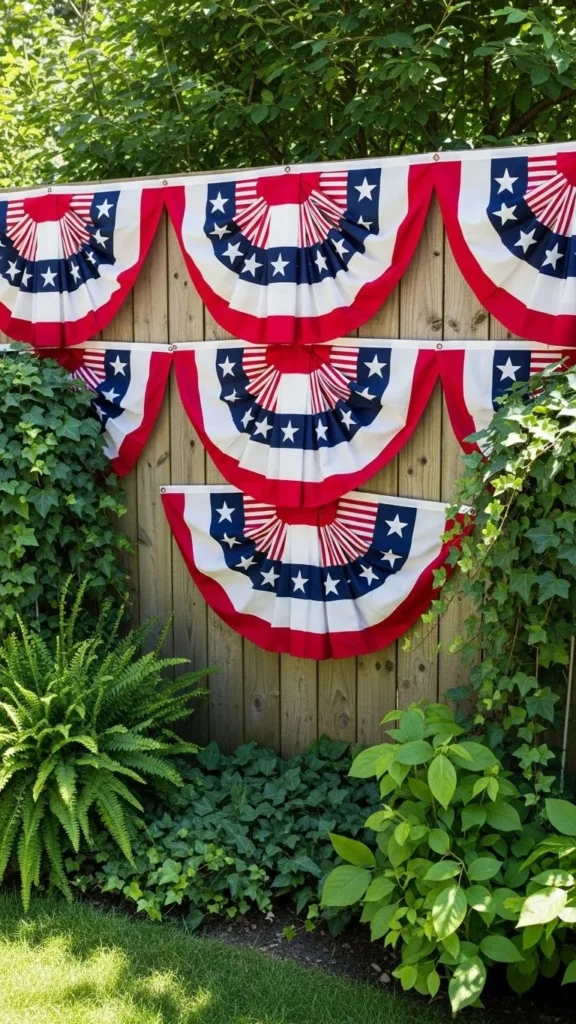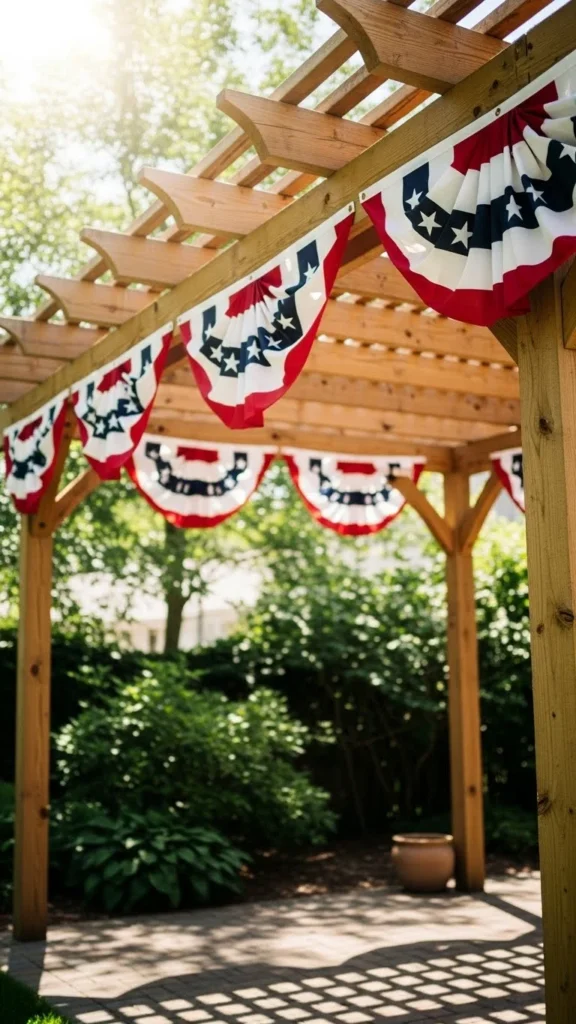Pergolas offer height that makes bunting visible from a distance. Drape lightly to avoid heavy sagging. This works well for cookouts and evening gatherings.