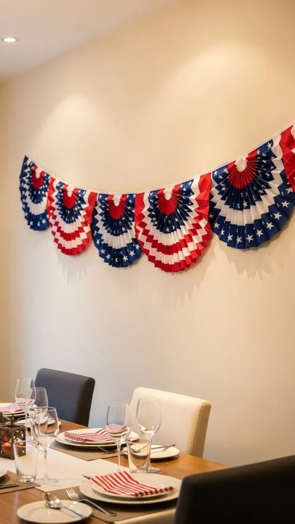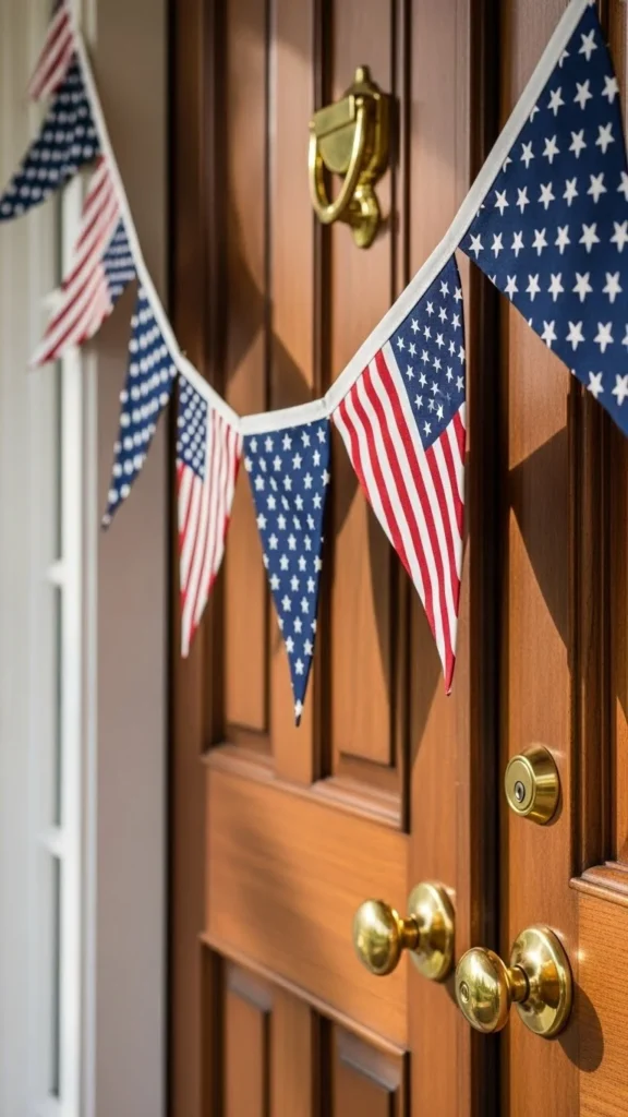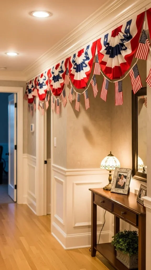 Entry hallways set the tone as guests arrive. Keep bunting narrow and centered. This idea suits small homes where outdoor décor is limited.