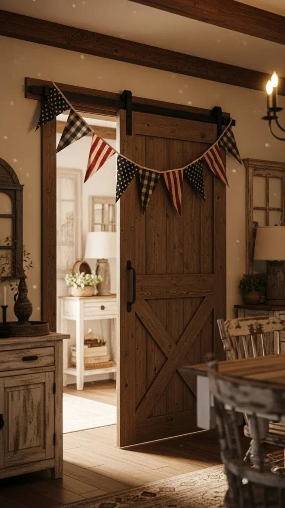 Barn doors already draw attention. A short bunting strip across the top adds seasonal flair without covering hardware.