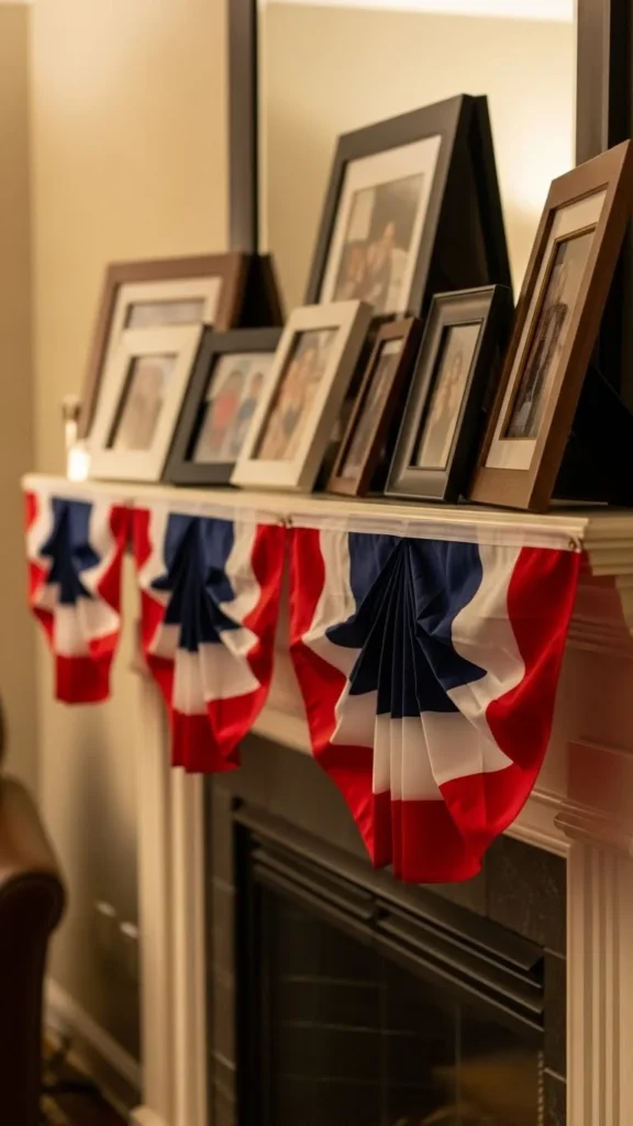 Indoor mantels give bunting a cozy role. Drape it once across the mantel edge and let the folds fall naturally. Keep other décor simple. Candles, framed photos, or small flags are enough. Lightweight fabric keeps everything in place without pins. This is ideal for apartments where outdoor décor is not allowed. After the holiday, fold and store the bunting flat to prevent creases.