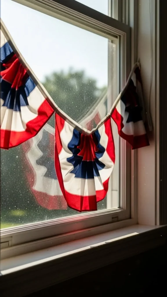 Window sills work well for subtle displays. Drape bunting along the sill or just under it. Indoors, lighter fabric avoids blocking light. Outdoors, secure ends tightly to prevent sagging. This idea works nicely for townhomes and condos with limited exterior options.