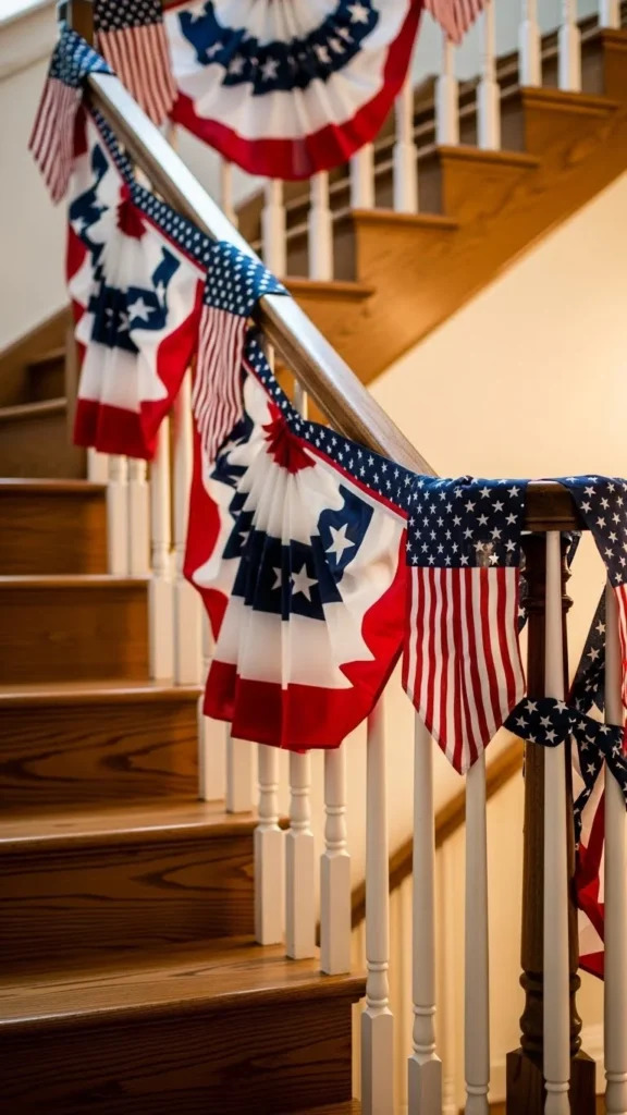 Wrap bunting loosely along stair banisters. Keep it on the outer rail so walking space stays clear. This works well indoors for family gatherings. Use fabric strips instead of heavy panels for safety.