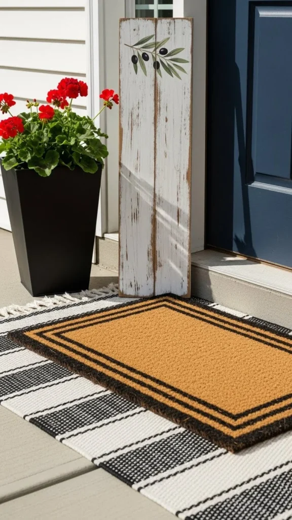 Pairing a sign with a mat anchors the entry.