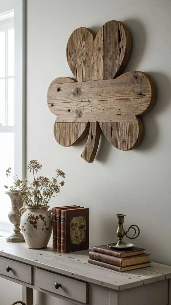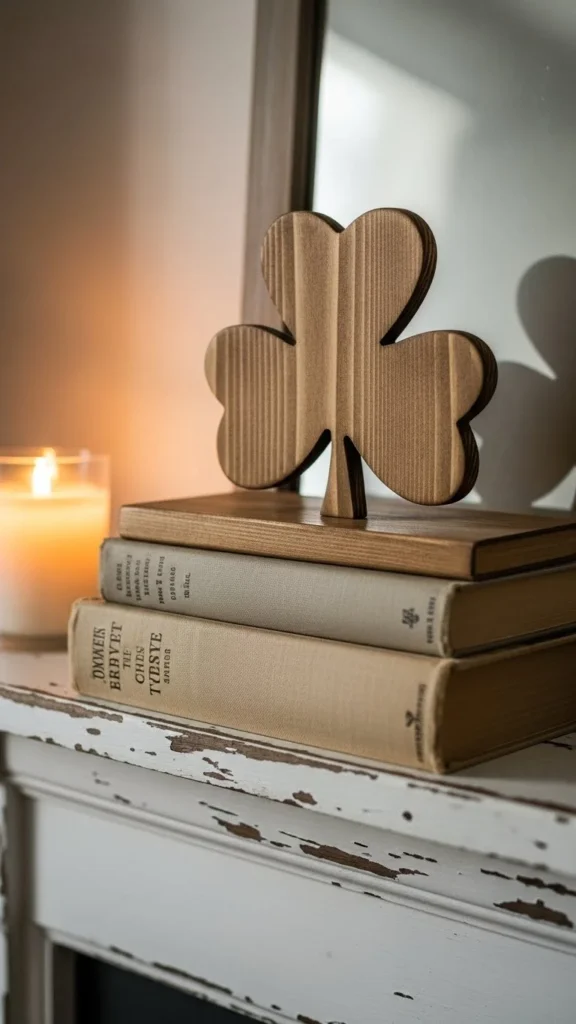 Shelf sitters are easy to move and style. A wooden clover cutout works well on mantels and bookcases. Choose unfinished or lightly washed wood. Thick pieces feel grounded and stable. Make one by cutting scrap wood into a clover shape and sanding the edges. No paint is required. Pair it with stacked books or a candle holder. This balances height and shape. Budget tip: keep it small. Large decor often costs more and feels harder to place. Small pieces give more flexibility.