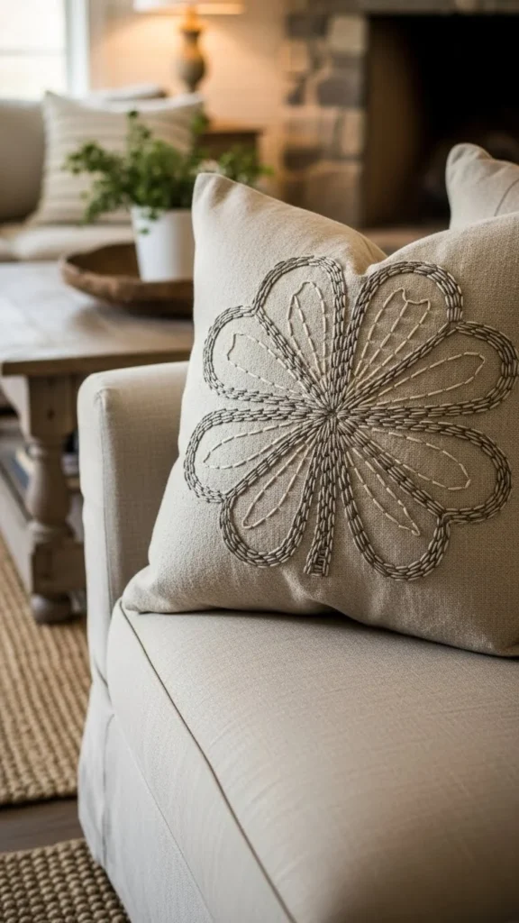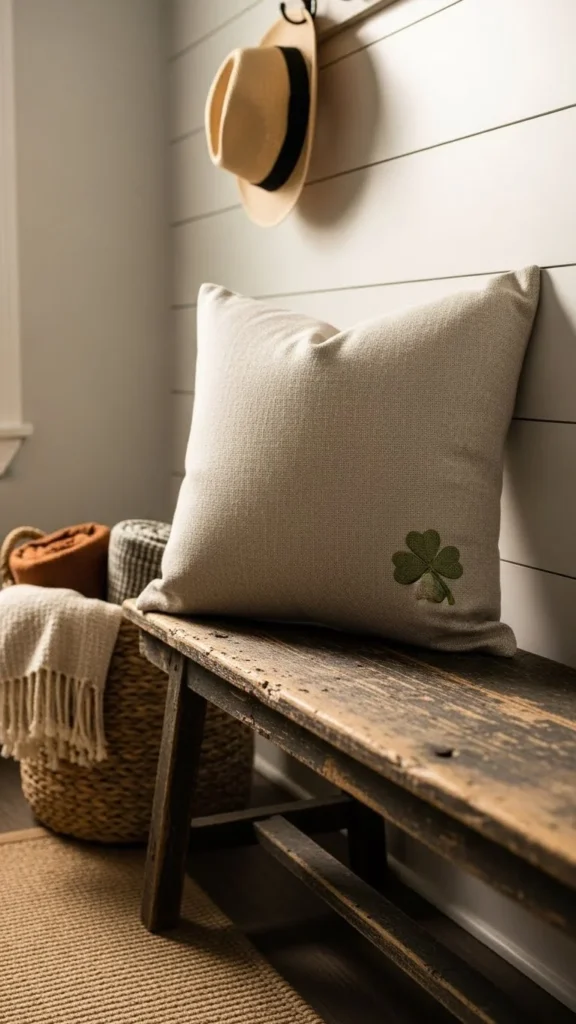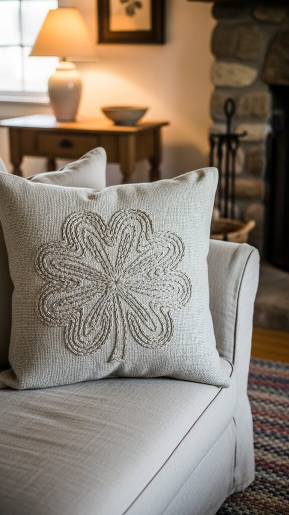 A stitched clover pillow adds softness to seating areas. Use linen or cotton covers. Hand-stitch or machine-stitch a simple clover outline. Avoid bold colors. Muted green or tan thread works best. Budget idea: add stitching to pillow covers you already own. This small change can refresh a room without replacing items.