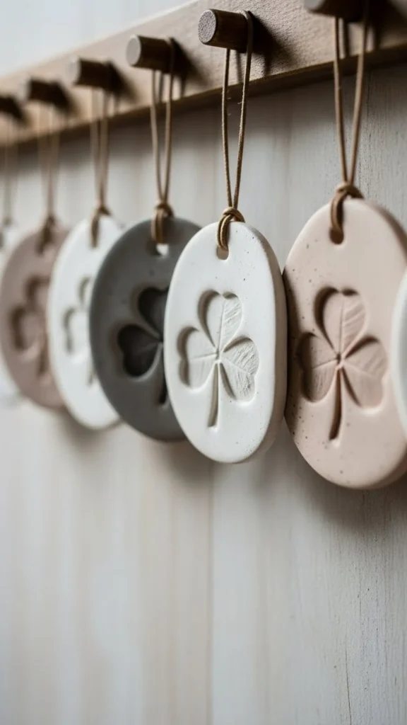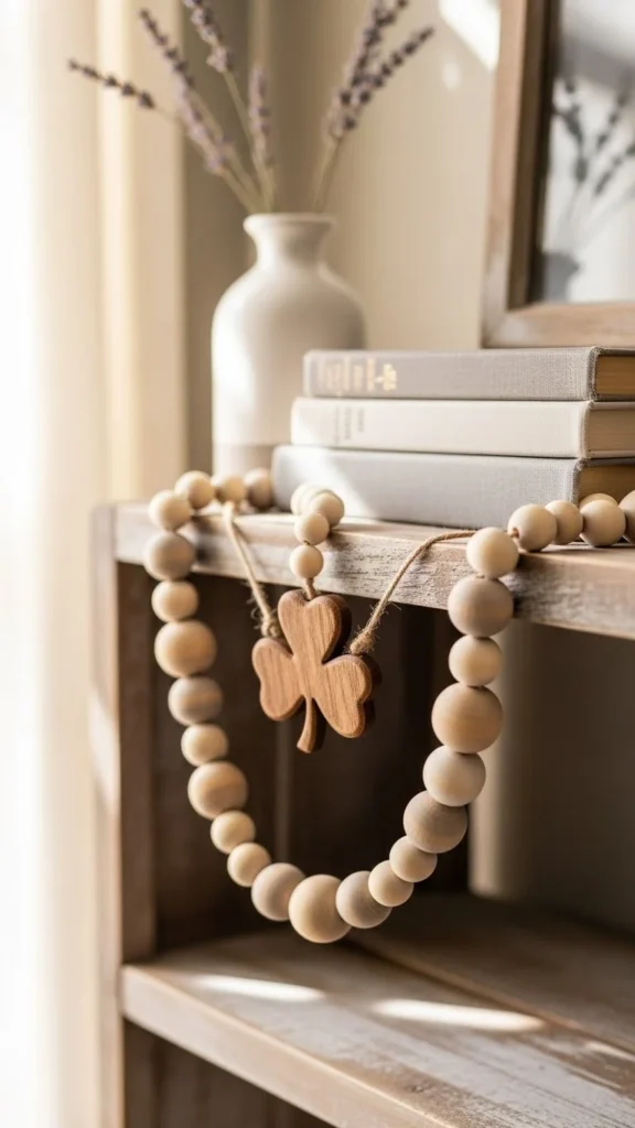 Wood bead garlands with a clover charm add texture to shelves. Keep beads unfinished or lightly stained. The clover can be wood or clay. Drape it loosely over books or baskets. Budget tip: make beads from air-dry clay. Let fingerprints show. That adds character.